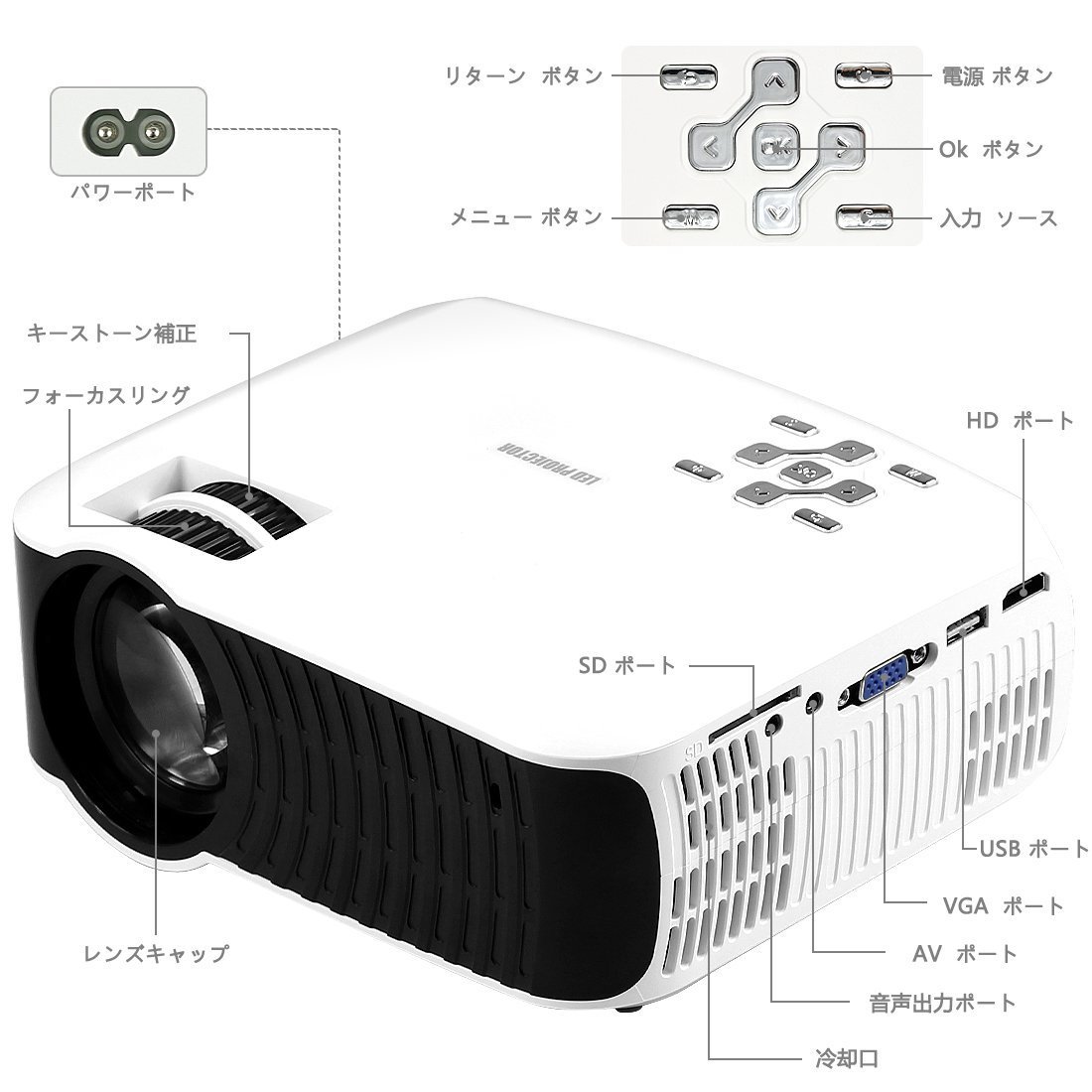 AV, VGA, HDMI input, USB, SD, 3.5 mm audio output.