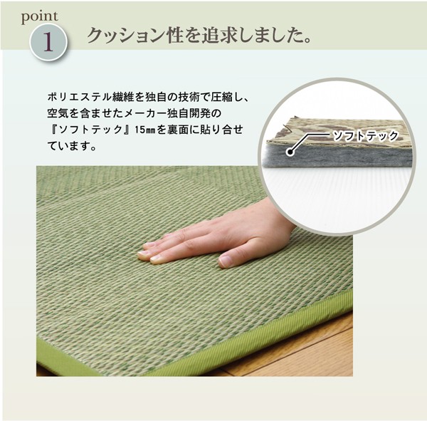クッション性を追求したボリュームタイプ(メーカー比3倍)のカーペットです。裏地にはソフトテックという素材を使用しています。ポリエステル繊維を、メーカーが新たに開発した独自の技術で圧縮し、圧倒的なクッション性のある素材に仕上げました。ボリュームがあり、床下への騒音を軽減する効果もあります。表地には国産(九州産)のい草を使用しています。一本一本が太く、表皮が厚く繊維がキメ細かいので弾力性があり、耐久性に優れています。い草には空気の自然浄化作用、湿度の調節作用などがあります。また汚れにくく、使用するうちに黄金色に変化し味が出ます。い草に青森ヒバ加工を施しています。(抗菌、防臭効果)