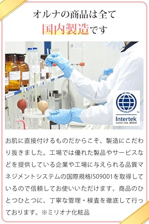 オルナを製造する工場は、品質マネジメントシステムの国際規格ISO9001を取得しています。商品のひとつひとつに、丁寧な管理・検査を徹底して行っております。※ミリオナ化粧品