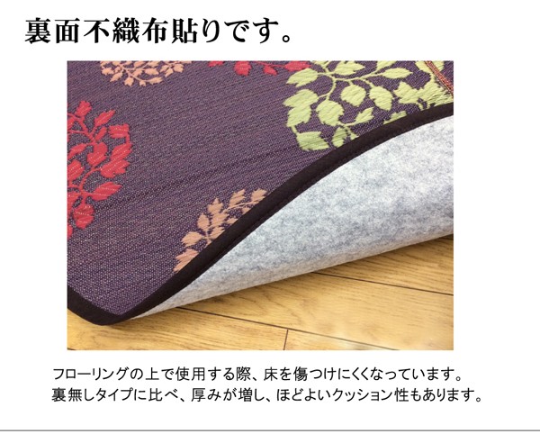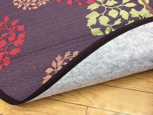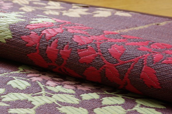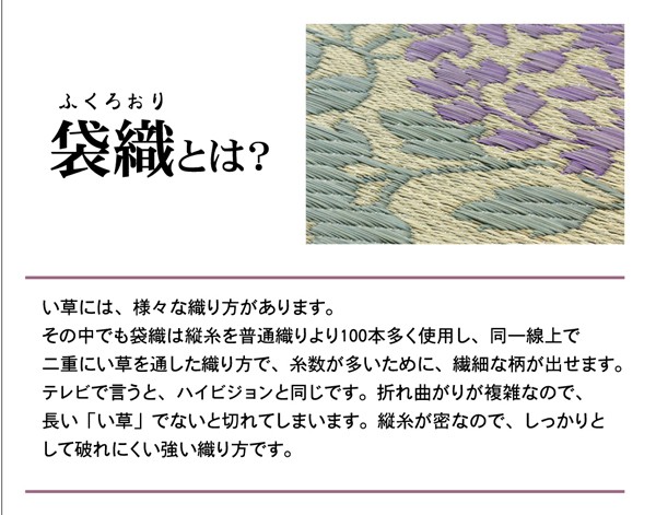 縦糸の本数が多い袋織りという技法で繊細な柄を出しています。折れ曲がりが複雑なので長いイ草を使用しないと切れてしまいます。縦糸が密なので、しっかりとして破れにくいのが特徴です。国産(九州産)のい草を使用しています。一本一本が太く、表皮が厚く繊維がキメ細かいので弾力性があり、耐久性に優れています。い草には空気の自然浄化作用、湿度の調節作用などがあります。また汚れにくく、使用するうちに黄金色に変化し味が出ます。い草に青森ヒバ加工を施しています。(抗菌、防臭効果)