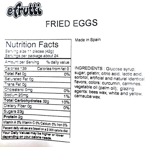 -. Binding : Misc. -. Brand : SweetGourmet -. EAN : 0786173821641 -. Feature : Start your day sunny side up with these gummy fried eggs! These fun mini gummies have a juicy peach taste with a fun fried egg look. / Peach Flavour. Made With Real Fruit Juice / Net Wt.: 1Lb / Fat Free, Peanut Free / Premium Quality -. IsAdultProduct : 0 -. Label : E.Frutti -. Manufacturer : E.Frutti -. MPN : na -. PackageQuantity : 1 -. PartNumber : na -. ProductGroup : Grocery -. ProductTypeName : GROCERY -. Publisher : E.Frutti -. Size : 1Lb -. Studio : E.Frutti -. Title : E.Frutti Mini Gummy Fried Eggs Candy, 16 Oz -. UPC : 813805006012