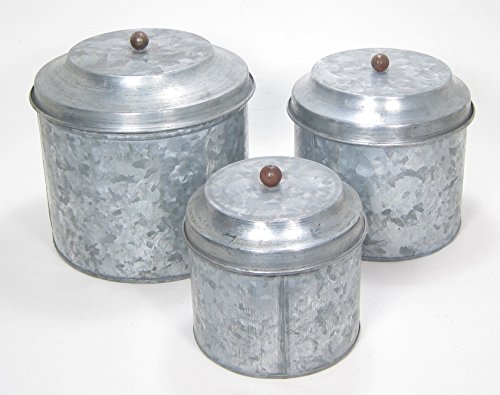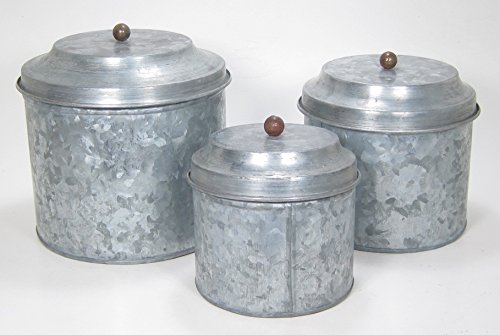Intended for decorative use only and not for food storage. The set includes one large, one medium, and on small canister. Approximate canister sizes: - Large canister is 7" h x 7" diameter. - Medium canister is 6" h x 6" diameter. - Small canister is 5" h x 5" diameter. The containers are made of galvanized metal which make them both durable and weather resistant.
