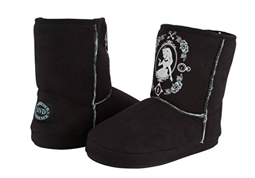 -. Feature : PLAYFUL PRACTICALITY: Who's not a fan of this charming tale? With little Alice peeking out from the front, surrounded by elements from the story, and embellished with her exclamation "Curiouser and curiouser!" on the heel, these will make you smile. And they're built with long-lasting man-made materials for easy care and plenty of wearing enjoyment / LIGHT WEIGHT LUXURY: Coddle your feet and the rest of you will thank you. Even with solid materials and fluffy fleece lining, these stay light on your feet. Since they're snug booties, they won't flop about, either / GENTEEL VICTORIAN COMFORT: You'll want to wear these to work, to play, to your kid's Scout troop meeting. You'll waltz all through the house swathed in cold-weather protection / EASY ON AND OFF: No matter how fuzzy you are when first waking up, you won't stumble or fumble to get these on. Keep 'em by the bed and just step right in. Ahhhhh / ADVENTURES IN WARMTH: With fleece lining, velvety exterior and cushiony insoles, your own personal Wonderland of comfort will wrap around your feet for many relaxing evenings to come!