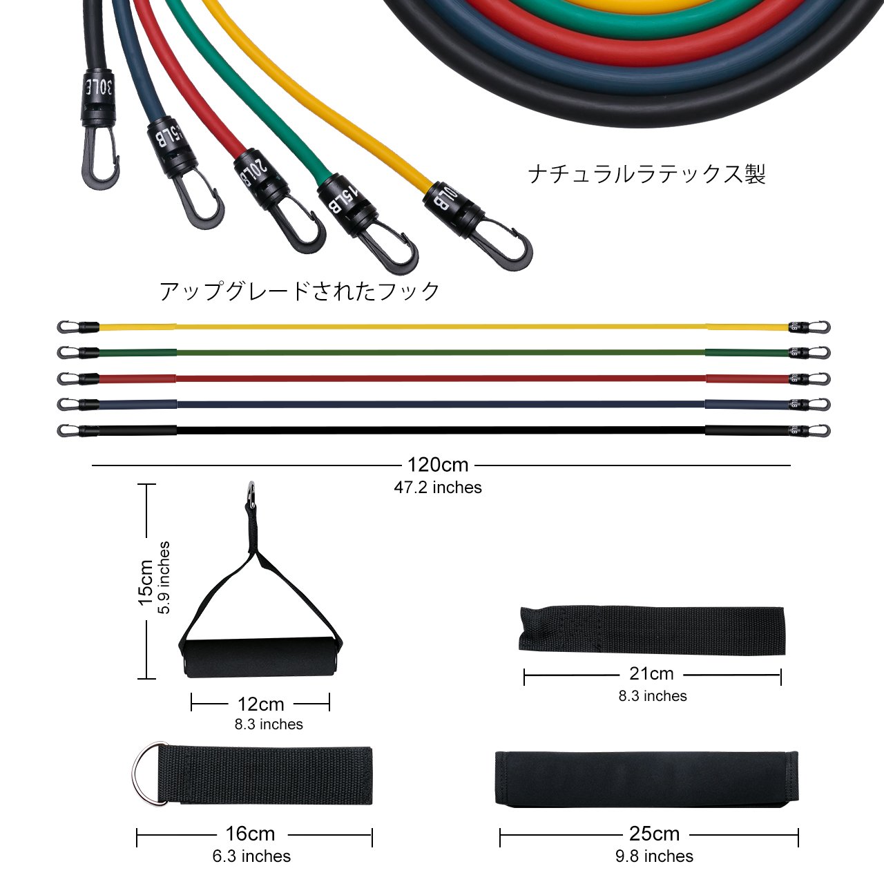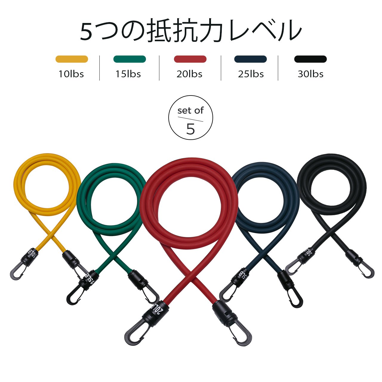 Training can be done by combining five bands arbitrarily, and the strength changes from approximately 5 kg to 50 kg, so you can easily adjust the load.