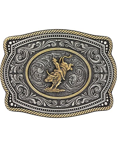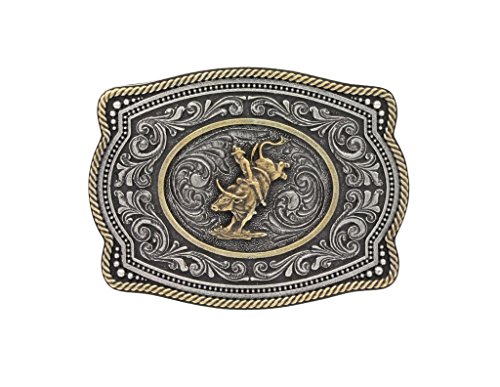 Binding : Apparel Product Description This darkly antiqued scalloped rectangular Attitude cast buckle has gold finished bull rider figure on a silver finished classic western engraved design surrounded by a thin smooth gold tone wire oval. More engraving detail surrounds the oval while a line of pin points forms an inner frame with a gold finished twisted rope design making the outer edge. Classic western filigree markings decorate the back for added detail.