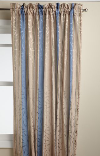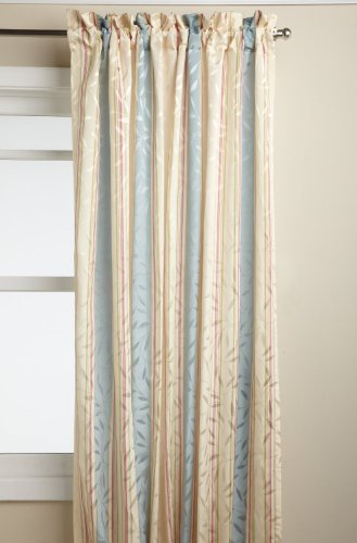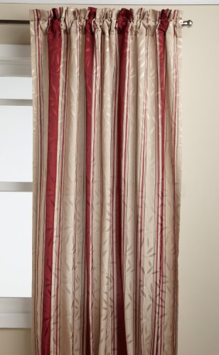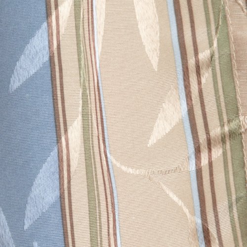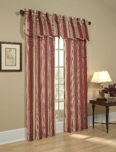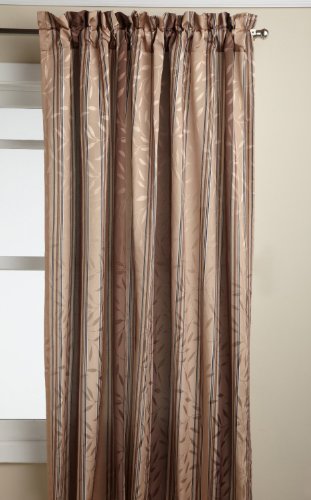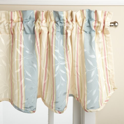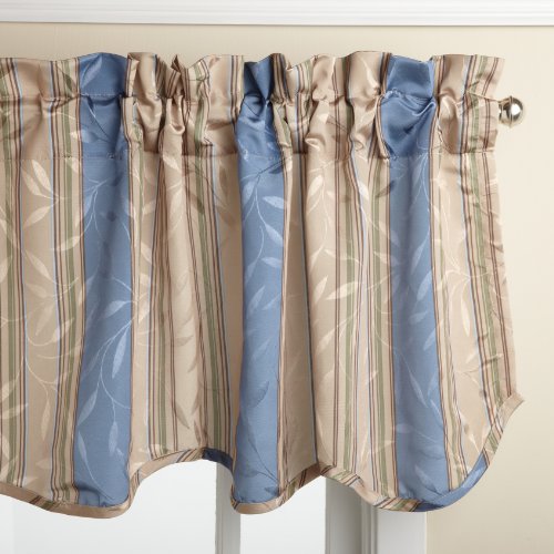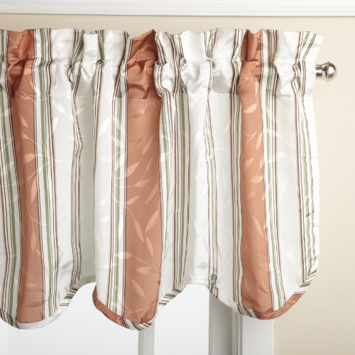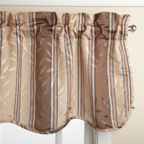 Deluxe heavy weight tone on tone jacquard tailored panel is woven in an all-over leaf motif using dull and shiny yarns for depth and interest and then further accented with a printed stripe motif. the matching scalloped valance is finished with a self fabric corded edge.Feature