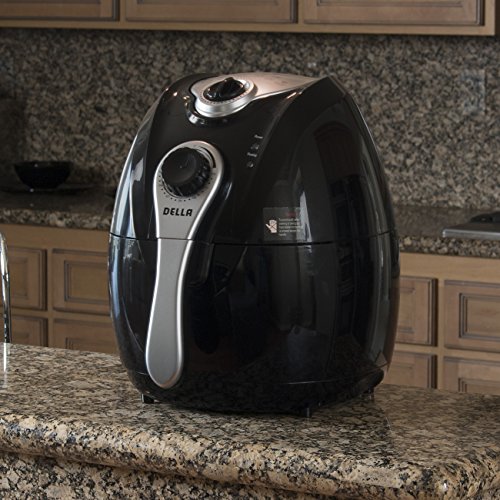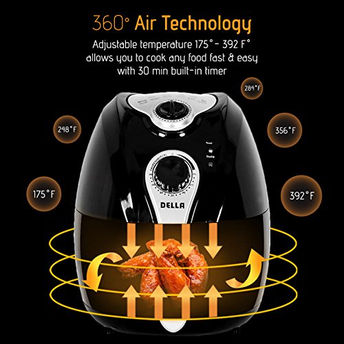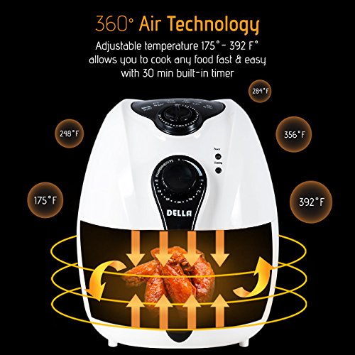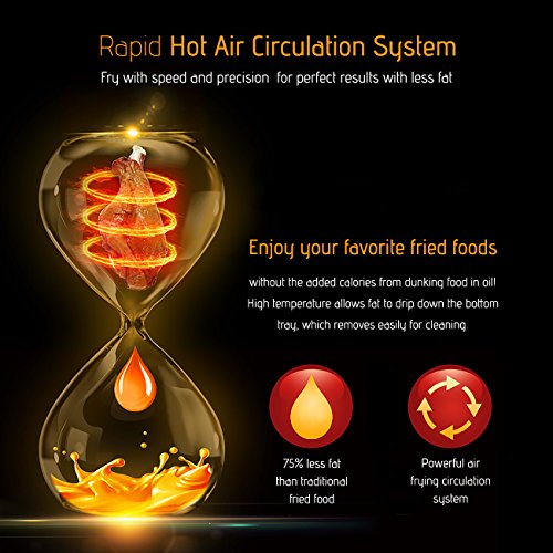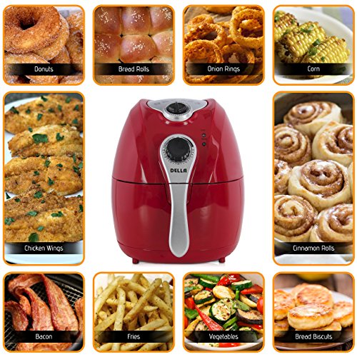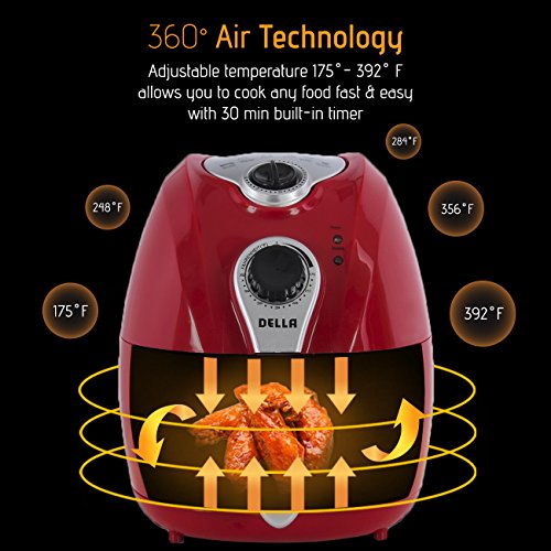 Latest Generation New model of electric Air Fryer allows you to enjoy your favorite fried snacks or foods without the added calories from dunking food in oil Powerful air frying technology with rapid hot air circulation system gives your food a crispy fried finish Great for traditional French fries and Onion rings Fast cooking performance and very short preheating time enables you to prepare a meal for the whole family in record time! Fry with speed and precision for perfect results with less fat. 30 minute timer with automatic shut off and ready signal gives you a perfect fry every time! Enjoy delicious full flavor deep fried foods without the use of unhealthy fats and oils Adjustable temperature control from 175°F - 392°F allows you to prepare a variety of food from crispy fries to juicy wings with little to no oil at all30 minute timer with automatic standby feature. The air fryer will automatically switch into standby mode when the cooking time is done. It also features a ready light to let the user know when the air fryer has reached the desired temperature It comes with a detachable basket for easy transfer from the fryer to a serving dish; Easy transportation and storage Protective plastic cover on food basket release button prevents accidental drop of the food basket holder No oil smell, no splatter, no mess Specifications: Color: Red Watt: 1500Voltage: 120v/60hzTimer: 0-30minTemperature Range: 176 to 392 degree Power Indicator: Yes Heating Indicator: Yes Mesh Basket Capacity: 2.8 Quart (2.7L)Fryer Pan Capacity: 4.4 Quart (4.2L)Detachable Basket: Yes Certification: ETL Listed Overall Dimension: 11"(W) x 13"(L) x 12-1/2"(H)Package Contents:1 x 1500W Electric Air Fryer1 x Tong Bonus1 x Recipe Book Bonus1 x Manual/p.Feature