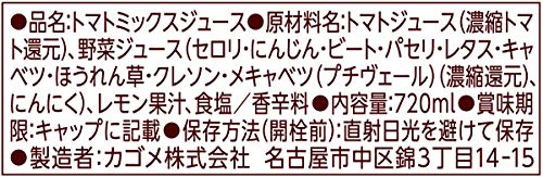 原材料:トマトジュース(濃縮トマト還元)、野菜ジュース(セロリ・にんじん・ビート・パセリ・レタス・キャベツ・ほうれん草・クレソン・メキャベツ(プチヴェール)(濃縮還元)、にんにく)、レモン果汁、食塩/香辛料