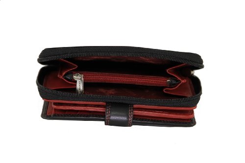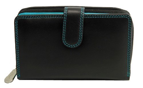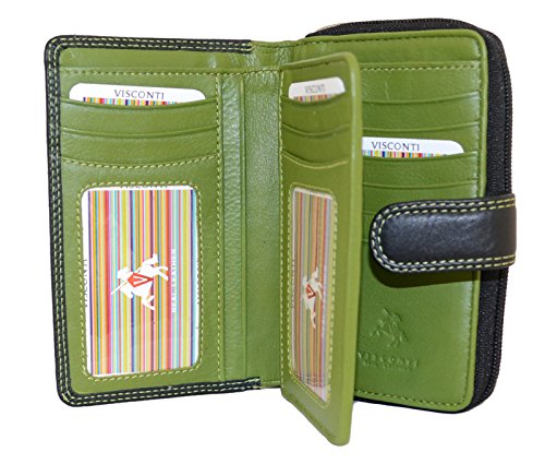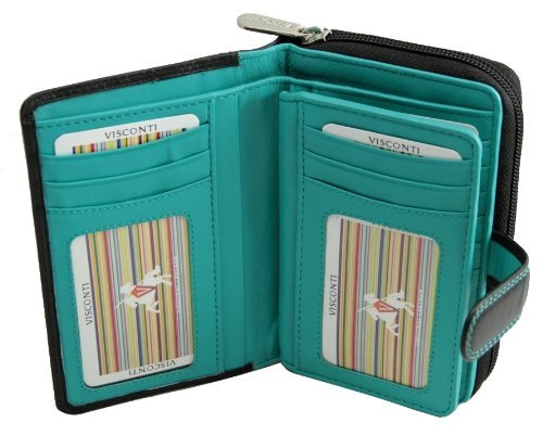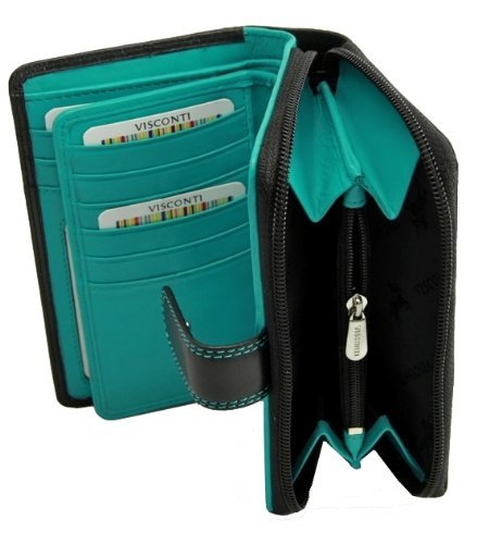 -. Feature : A soft Leather wallet from the popular Visconti collection / Holds 16 credit cards + 2 Window ID +1 Compartment for notes + Snap close to keep wallet securely shut / Large coin purse split into 2 compartments + additional secure zipped pocket for rings/other valuables / Dimensions: 3.15" x 5" , Colors: Black/ Aqua, Black/ Green, Black/ Yellow, Black/ Red / Contrast and double stitching + Gift Boxed