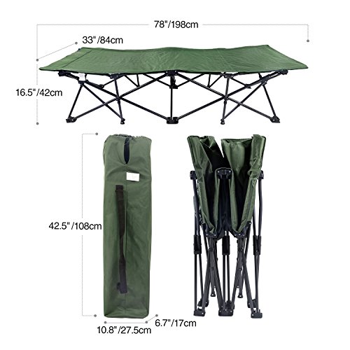 ★ HEAVY-DUTY: Setup size 78"×33"×16.5", Folded size 10.8"×6.7"×42.5". Weight 20.7lbs. Can fit person up to 6 ft.5 in, supports up to 250lbs. Attention: The camping cot will be delivered with stochastic leg colors in black, gray or champagne