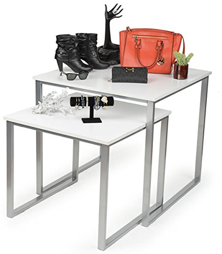 -. Feature : Set of 2 square tables: 27" and 32" / Low profile design is great for displaying items / White finish with silver steel frame / Anti-slip padding on legs helps to prevent scratches and scuffs / Displays2go SKU No.:NSTPCSQSGW