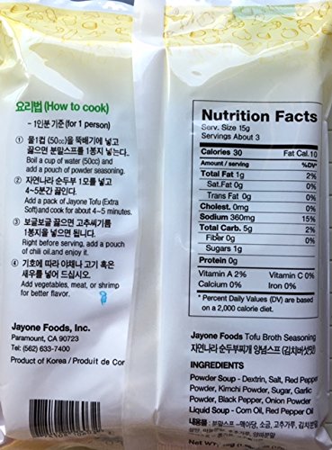 -. Feature : This package contains seasoning for the famous Korean Tofu Soup / All natural flavor, no preservatives, no MSG / Net Wt.: 1.58 Oz. (45g) / Add a pack of soft tofu, seafoods and/or meat for better flavor / Product of Korea