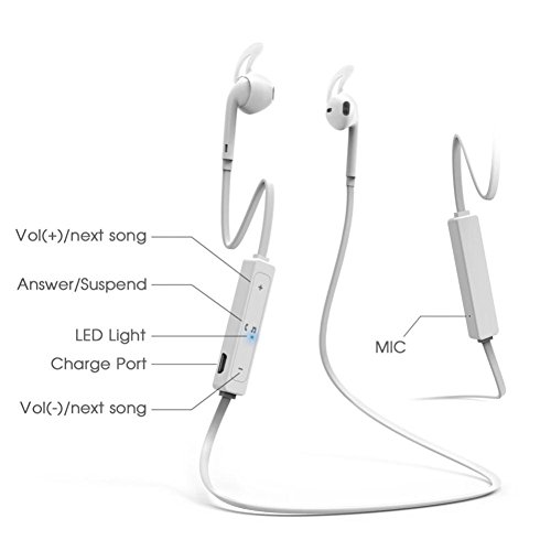 -. Feature : Sweatproof and water resistant design. / Bluetooth version: V4.0,Bluetooth Headset & Hands-free, A2DP, AVRCP. / Ultra-lightweight at 0.48 ounces, these earbuds do not cause any ear discomfort, and can be effortlessly worn all day. Includes S/M/L sport eartips and in-ear earhooks, so you will never worry about the earbuds falling out. The uniquely ergonomic design ensures a comfortable and secure fit for running, jogging, cycling and many other activities. / Built-in microphone with CVC 6.0 digital noise reduction technology provides a crystal clear phone conversation even in noisy environments, for example, jogging in the street or working out at the gym. Premium Bluetooth earbuds for skip-free music outdoors. / Perfect compatibility, support most mobile phones with bluetooth device,Pad and desktop computer.