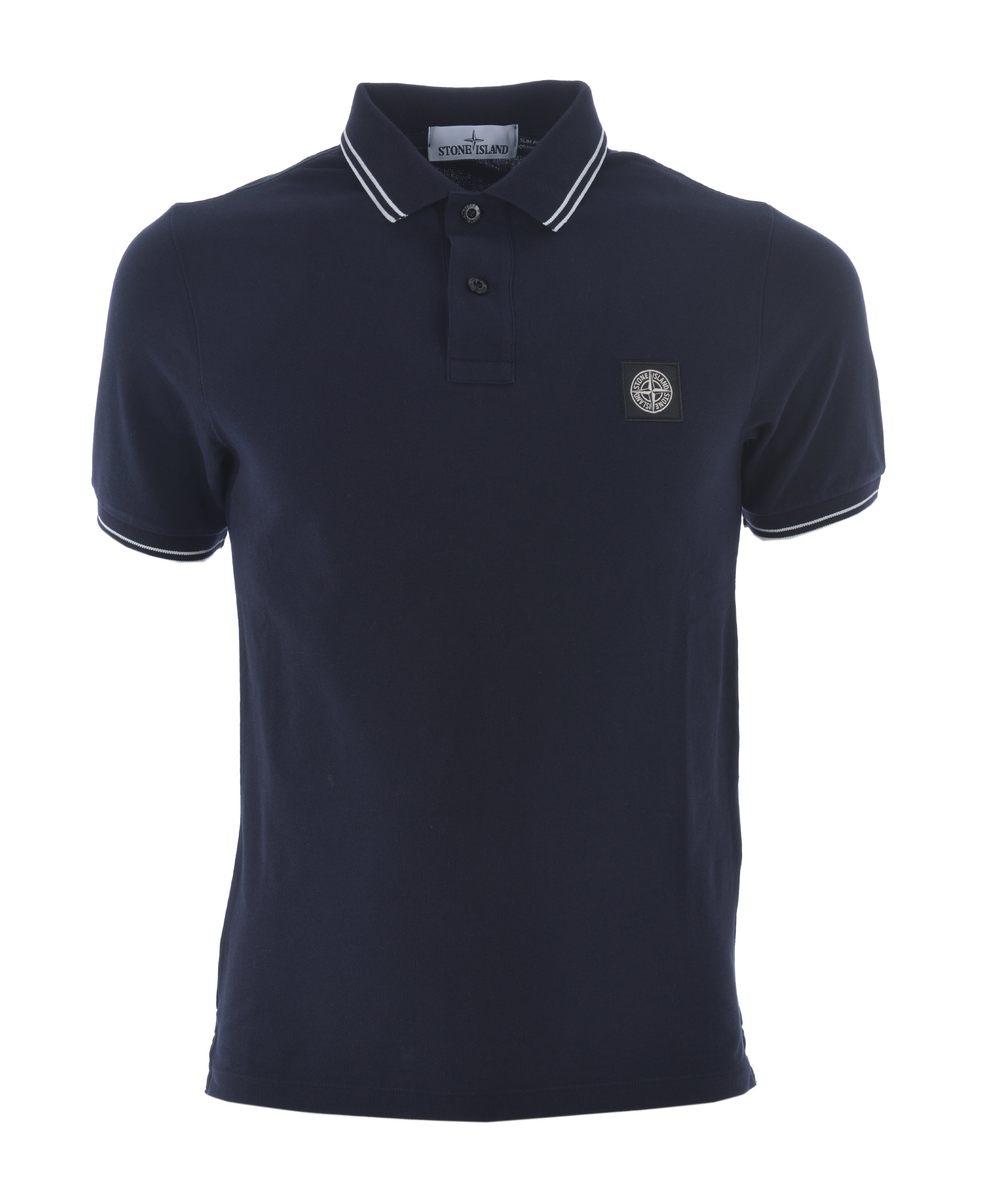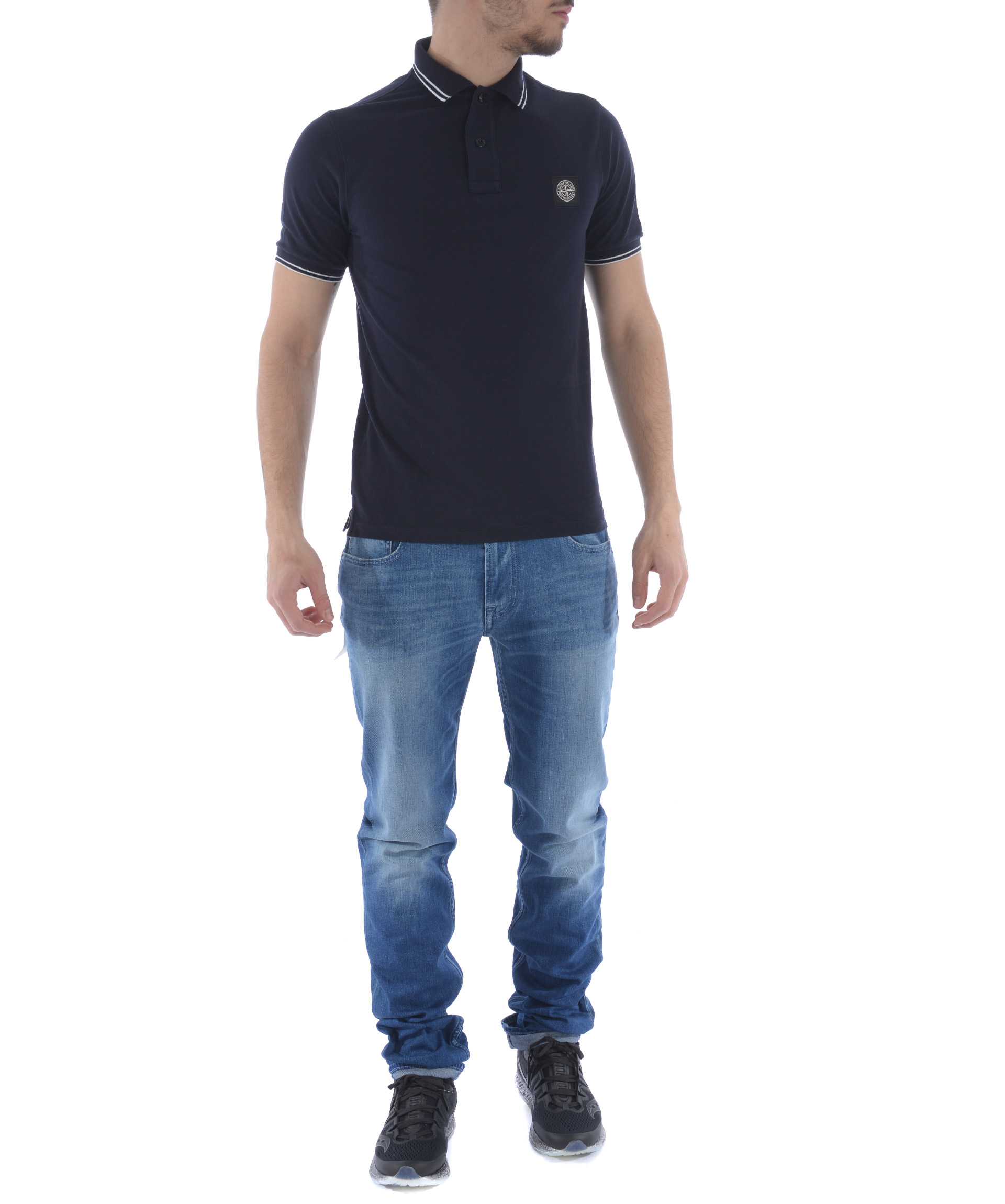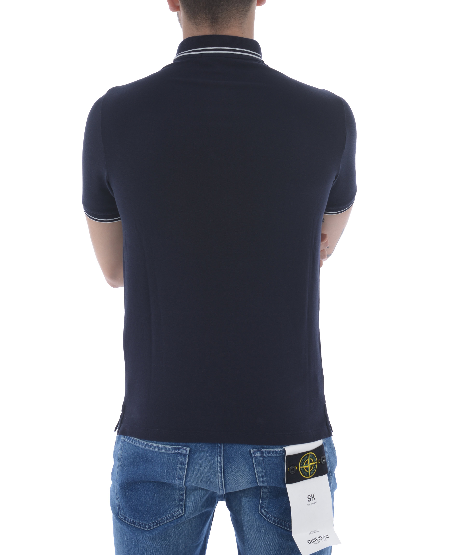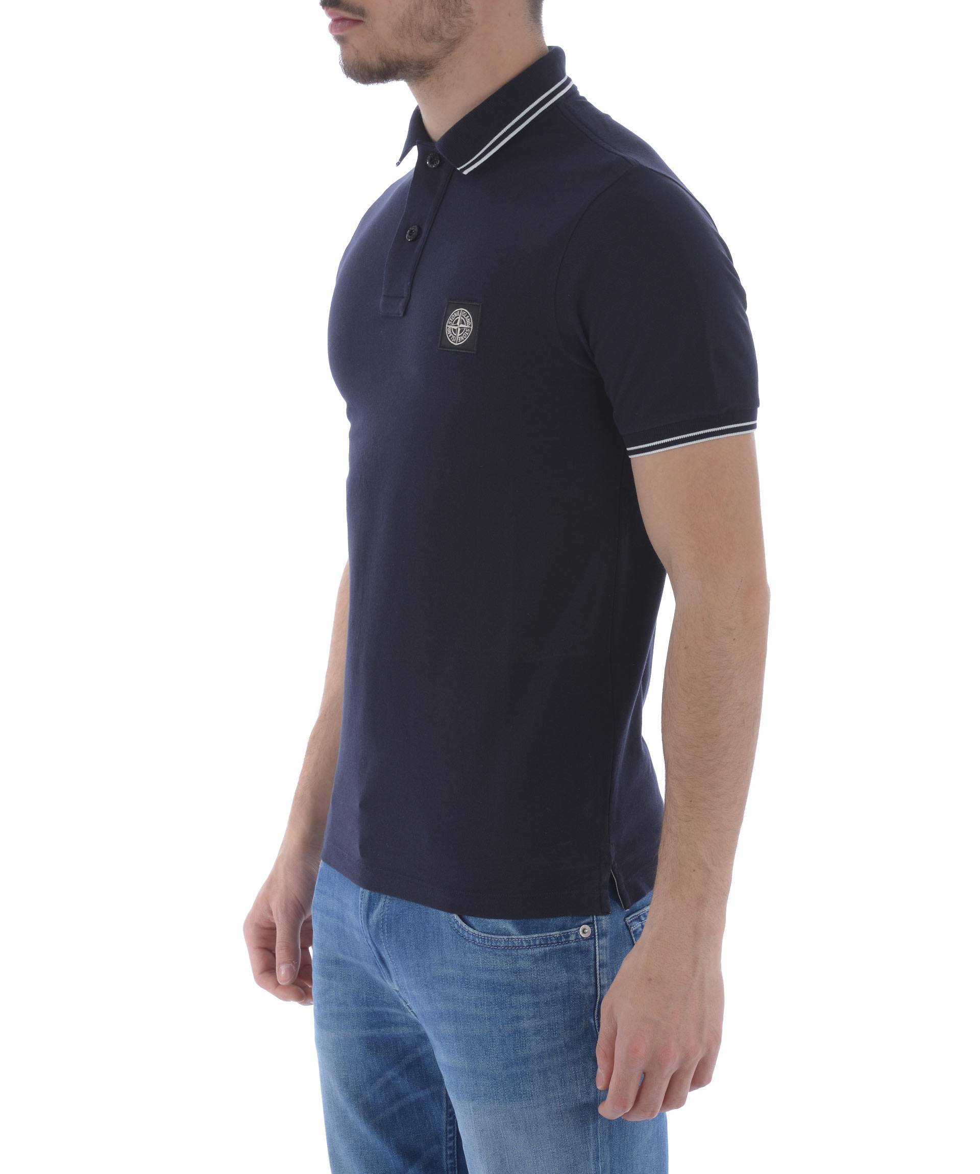 Polo Stone Island in piquet stretch Blu scuro. Colletto a costine con profili a contrasto. Apertura a 2 bottoni. Manica corta con bordo a costine e profili a contrasto. Patch logo frontale. Slim fit. Misura in foto S 95% cotone, 5% elastene