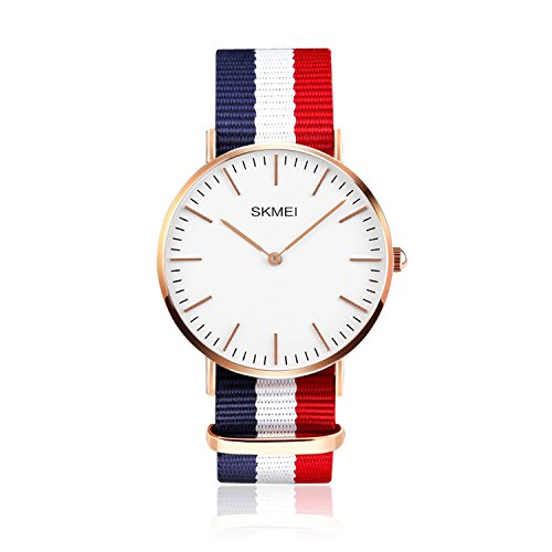 -. Feature : SIMPLE CLASSIC CASUAL DESIGN: affordable casual design, Canvas band, Round big dial dress watch with gold-tone stainless steel case featuring white dial, simplicity of business casual, bring you the back to the classic. Also make it a great gift for family or friends. / FRANCE FLAG COLOR: Vive la France! This watch celebrates France with the distinctive and stirring colors of the French tricolour flag, perfect for any sports fan or athlete. / NYLON Band: Tricolored canvas band with center stripe and buckle closure, Striped white, red and blue nylon strap. Exceptionally strong, abrasion resistant, low in moisture absorbency & easy to wash. / DURABLE & SUPER THIN: Original quartz movement with analog display, provide precise and accurate time keeping. Stainless steel water proof case cover, 6mm thin design, super thin and light. / WATERPROOF FOR DAILY USE:98 ft waterproof (30 M) - 3ATM. Perfect for all kind of business, casual, indoor activities or daily use. NOTE:In general, withstands splashes or brief immersion in water, but not suitable for swimming.