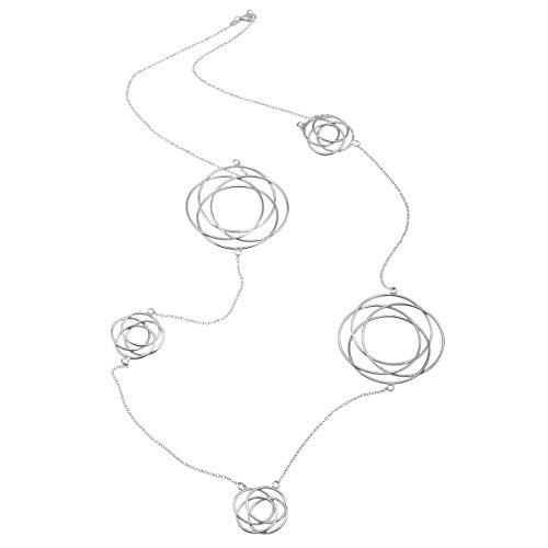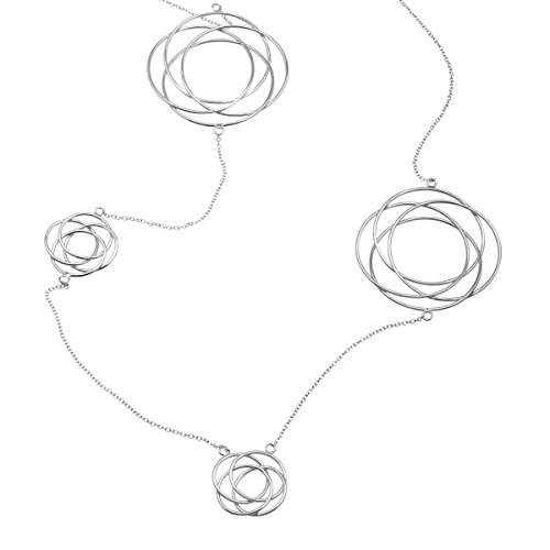 Station necklaces add pizzazz to any outfit and this piece adds an ultramodern twist. Large and small interlocking circular stations set on a 34-inch cable chain are fashioned from sterling silver.