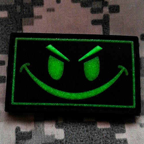HIGH QUALITY PVC MORALE PATCH featuring GLOW IN THE DARK SMILEY FACE. Hook velcro sewn on back so can be applied to any loop velcro surface. Not glued! Patch is extremely durable and cleans easily with warm water and soap.