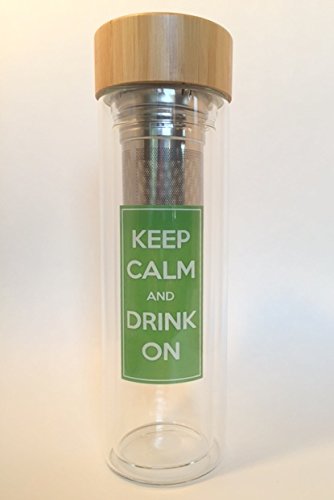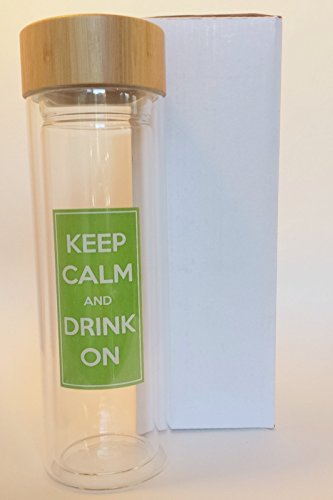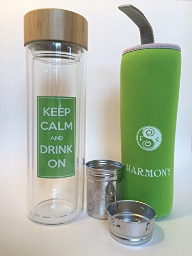 - Feature : ON SALE - This all-in-one tea infuser & travel mug makes enjoying loose-leaf tea on the go simple and stylish. Also great for fruit infused water - detox water. Your portable drinking bottle comes with a beautiful green Harmony sleeve. Makes a great sports bottle! / MAKES AN EXCELLENT GIFT! Fun and novel saying "Keep Calm and Drink On" makes people say "Where did you get that... I want one". This Tea tumbler stands out in the office and even at home because of its unique and beautiful design. Perfect gift for Men, Women, Co-workers, Boss, Friends, Students, Grandma, Grandpa. Comes in a beautiful white carton box, ready to add a bow for gifting. Take this travel tumbler on the go to the gym, yoga, school, work, etc. / DURABLE AND EASY TO USE - Sturdy Double Walled Borosilicate Quality Glass and a Silicone Sleeve for easy gripping and protection from the heat. Clear Borosilicate Double Walled Glass Infuser Won't Burn Hands. Just like your regular glassware at home the wide open spout is easy to clean and can accommodate ice cubes and fruit pieces and the twist-off wide spout is great for easy pouring and drinking. / MAKES GREAT TEA AND DETOX WATER - PERFECT FOR HOT OR COLD BEVERAGES. / WE CARE ABOUT OUR CUSTOMERS! We offer a full 30 day money back guarantee. ECO FRIENDLY AND SAFE - 100% BPA Free & non-toxic and the healthiest drink ware. MAKES AN ECO-FRIENDLY ALTERNATIVE TO BOTTLED WATER!