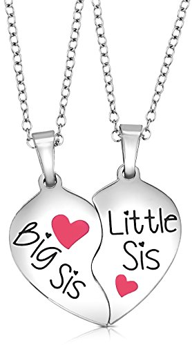 Set of TWO pink accented heart halves that fit together to form one heart - One necklace for big sister and one for little sister