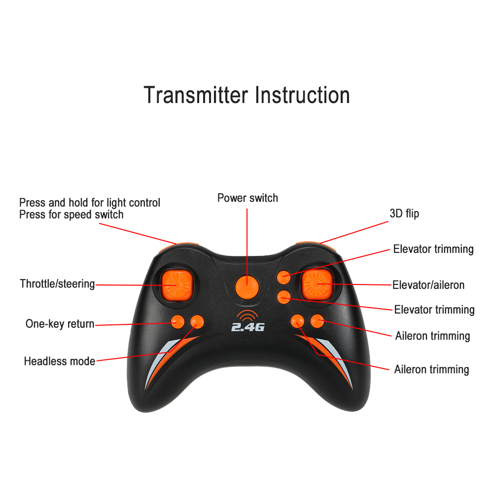 Function: Forward/backward, up/down, left/right, sideward flight, hovering, 3D-flip, headless mode, high/low speed, one-key return