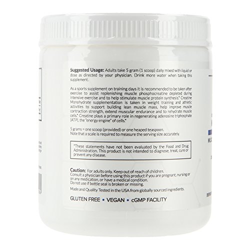 -. Feature : Ultra-Pure Micronized Creatine Monohydrate Powder, Pure for Superior Bio-Availability, Dissolves easily, No odor; Tasteless. / Suitable for Vegans. Produced without any GMO inputs. ETO-free, Non-Irradiated; No excipients or fillers added. / Take daily to optimize Muscle Energy and Training Strength Levels, Healthy Muscle Aging and Cognitive Function. / Take after intensive activities or sports to replenish Muscle Fiber Hydration and Muscle Fullness. / Recommended as part of a core training stack to support maximizing muscle building, strength levels and/or body conditioning goals.