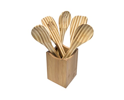 -. Title : 5 Piece Premium Bamboo Kitchen Serving Utensil Set with Striped Pattern with Bamboo Holder; Cooking and Baking Tools and Gadgets with Organizer by Top Notch Kitchenware!