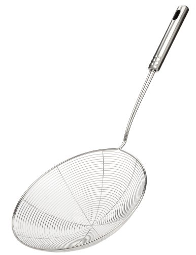 -. Feature : Wide stainless brim and rod makes it easy to scoop up as well as sit in any pot or bowl / Also comes with a hanging loop for your convenience / The stainless steel handle is long for comfortable handling without getting too close to the heat / Great for straining whatever excess liquid from any foods - fruits, vegetables, pasta and more! / This is a high quality tool guaranteed to last you a lifetime of use