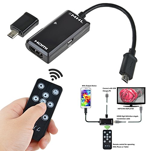 Features: * Micro-USB to HDMI adapter with remote control. * Turns your phone's USB-port into a standard HDMI port. * With remote control to control and access content on your phone. * Supports Max resolution to 1080p and all bandwidth between 25-75MHz. * Support 8 channel (e. G., 7.1 surround sound) uncompressed audio. * Support audio transfer up to 192kHz. * Keeps your phone charges while connected. * Compatible with Samsung Galaxy Note 2/ S3 SIII/ S3 Mini/ S4 SIV/S4 Mini/HTC ONE,etc. * also support Galaxy TAB 3, BUT Attention pls: (Remote control only for Samsung smartPhone)