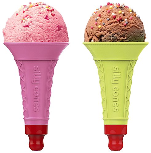Silly ConesTM are unique reuseable ice cream cones inspired by childhood memories of eating classic wafer cone ice creams. They take a generous single serving of ice cream (or frozen yogurt) and after eating all the ice cream in the top, you can drink the melted ice cream from the bottom using the pull-push bottle valve.