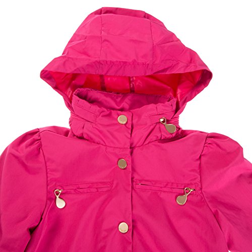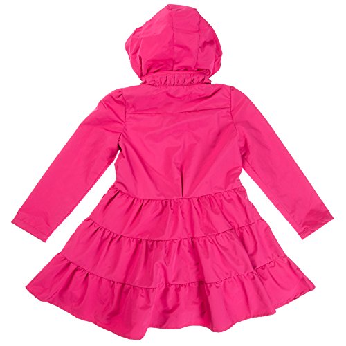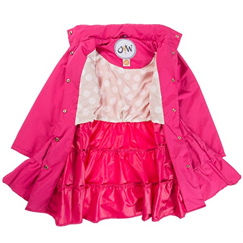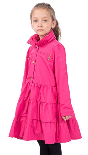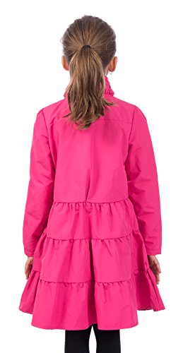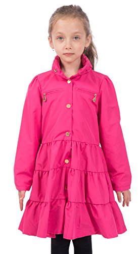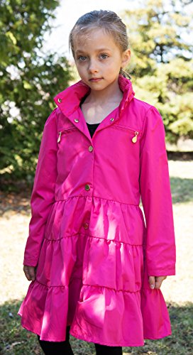Lightweight Twirl jacket in a fit-and-flare dress design with a high collar and exceptional stitching layered skirt detail. Features gold metal snap button closure that allows your child open and close raincoat with ease