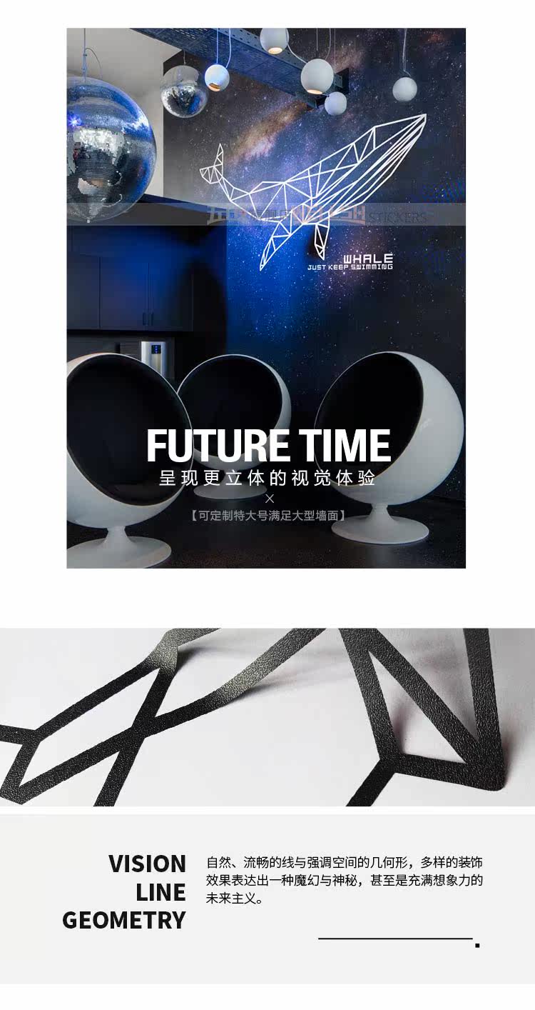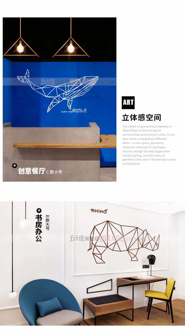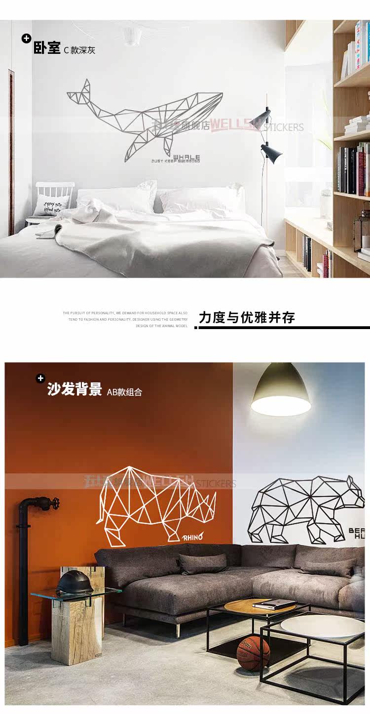 创意卧室墙贴 装饰客厅沙发背景墙上贴画几何犀牛鲸墙纸玄关自粘