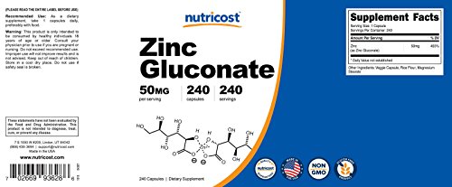 Nutricost's Zinc Gluconate provides 50mg of Zinc Gluconate in every serving. Zinc is necessary for everything from a healthy immune system to healthy reproduction, digestion, brain and metabolism function.Feature