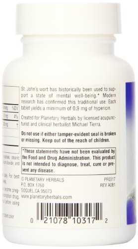 ReleaseDate : 2015-06-22 Studio : Planetary Herbals Publisher : Planetary Herbals Binding : Health and Beauty Product Description St. John's wort has historically been used to support a state of mental well-being. Modern research has confirmed this traditional use. Each tablet yields a minimum of 0.9 mg of hypericin. 0