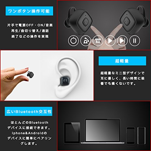 -. Feature : ♬【充電と収納可能のモバイルバッテリー箱】♪600mah充電機能搭載のコンパクト収納箱が付き、イヤホンへ4回充電可能です。ヘッドセットの方は、両耳をペアリングして同時に使う場合、2~3時間再生可能で、片耳を使う場合、3~4時間動作できます 。♪コンタクトと同じくらいの大きさで収納はとても便利、持ち運びも楽です。 / ♬【片耳両耳とも対応】♪ドライブ、電話会議や作業しながら、片耳で音楽を楽しめ、両手を塞ぐことなく通話できます。♪恋人、家族、友達と一緒に音楽を聞く、タブレットで映画を見る時に、両耳のヘッドセットを分かち合いたら、よい雰囲気を作れます。 / ♬【V4.2+EDR バランス良い音質】♪CSR8645のBuletooth 4.2チップを採用して、安定性ある音声伝送かつ耐高温を保証します、長時間使用した時に、発熱する恐れがありません。♪6.0 CVノイズキャンセリング技術(専門ノイズキャンセリングヘッドポンより弱い)採用、外部の騒音を抑え、純粋で真実なサウンドを体験することでき。♪専門的な調律技術でHIFIステレオ音質を実現して、重低音が驚愕であり、中高音が快適で、人間の聴覚に最適なバランスを実現します。 / ♬【分離式 超軽量マグネット吸着設計】♪分離式デザインで古い版の左右連続されたBluetoothイヤホンと比べて、この完全ワイヤレスイヤホンは線の邪魔がありません。♪超軽量で耳に優しく、快適に装着できます。♪充電ボックスはマグネット吸着設計なので、充電ボックスを反転されても、イヤホンは落ちません。スポーツ、運動、通勤、会議、ジム、旅行などにいろいろな場所に適用します。 / ♬【交互性】♪2台デバイスを同時に接続可能です。iPhone7/7 Plus/6s/6/6s plus/plus/5/5s/5c/iPad 4/3/2/iPad Air/iPod/New Macbook/Samsung Galaxy S6/S5/S4/Galaxy note 5/Sony/スマートフォン/タブレットなどのBluetooth対応デバイスに対応します。 ♪保証:一年の保証と24時間以内の専門的なアフターサービスを提供して、お客様はいかなるの問題があれば、御遠慮なくて、当社に連絡してください。 もし初期不良或いは他の何か問題がございましたら、いつでもお気軽にお問い合わせくださいね。弊社の店からご購入の商品だけ一年保証対応できます。どうぞご了承ください。