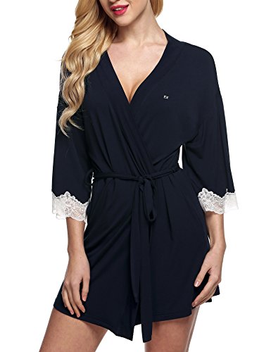 Ekouaer Kimono Short Robe Woman Lace Sleepwear Bridal Lingerie Nighty (Navy Dot, Small)