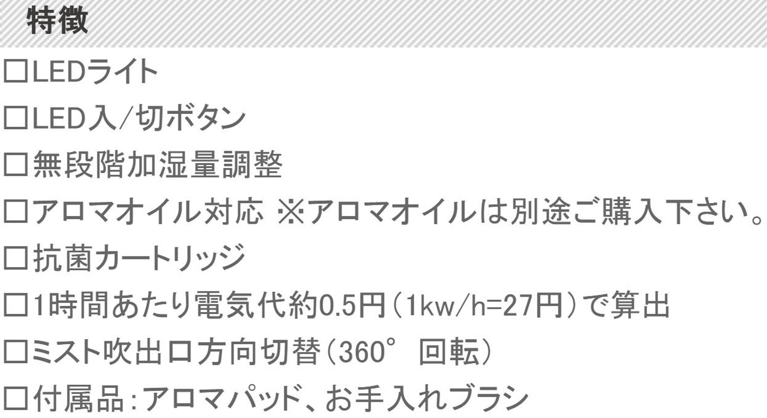● Electricity cost per hour is about 0.54 yen (tax included) * Calculated at 1 kw / h = 27 yen (tax included)