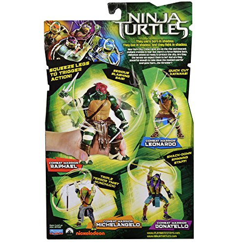 -. Binding : Toy -. Brand : Nickelodeon -. EAN : 0885629856906 -. Feature : They were born in the shadow; They live in the shadow; And they fight in the shadow / Serious slashing sais / Squeeze the legs to trigger action / Combat Warrior Raphael / 2012 Viacom International Inc. All Rights Reserved; TEENAGE MUTANT NINJA TURTLES and all related titles, logos and characters are trademarks of Viacom International Inc. -. IsAdultProduct : 0 -. Label : Playmates - Toys -. Manufacturer : Playmates - Toys -. Model : 91544 -. MPN : VLS-193 -. PackageQuantity : 1 -. PartNumber : VLS-193 -. ProductGroup : Toy -. ProductTypeName : TOYS_AND_GAMES -. Publisher : Playmates - Toys -. ReleaseDate : 2014-07-05 -. Studio : Playmates - Toys -. Title : Teenage Mutant Ninja Turtles Movie Deluxe Raphael Figure -. UPC : 885629856906 -. Warranty : No Warranty