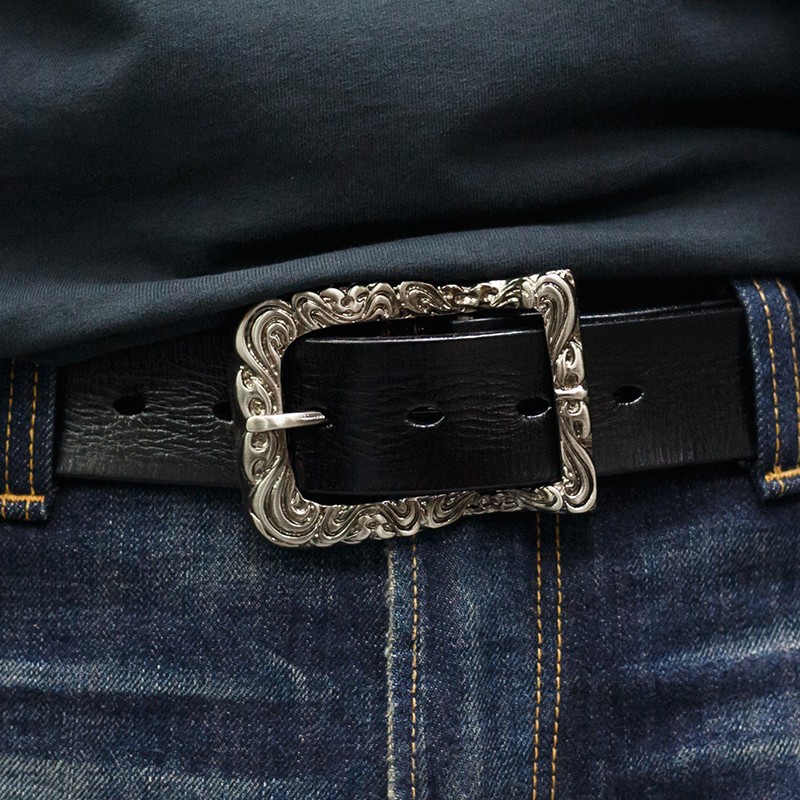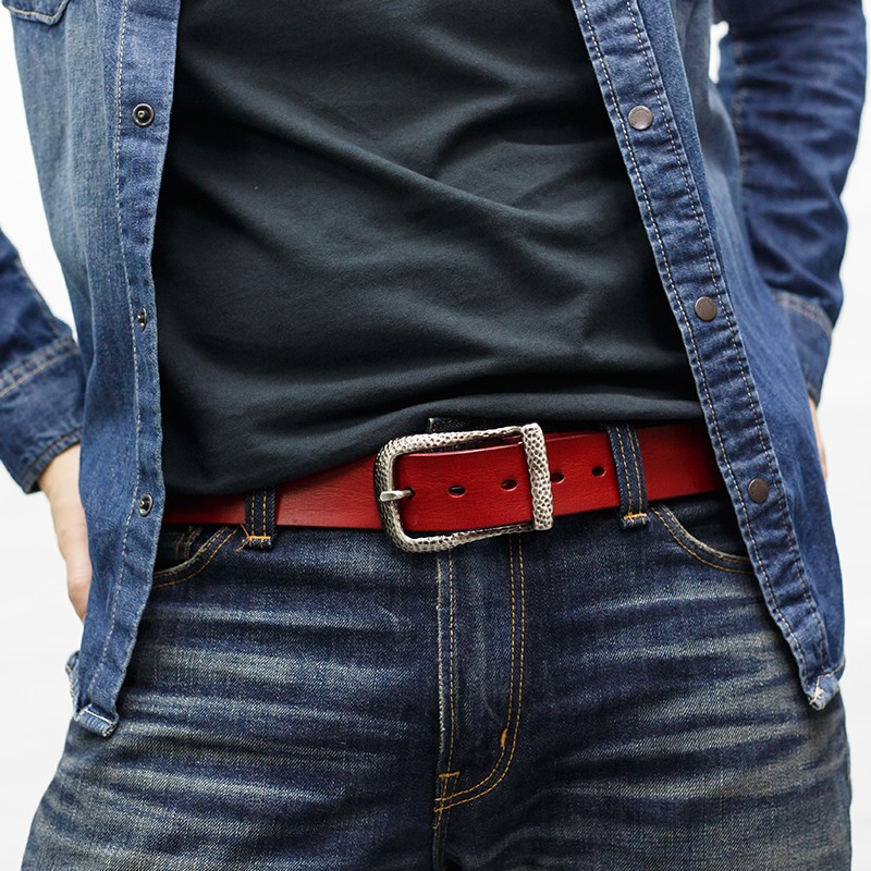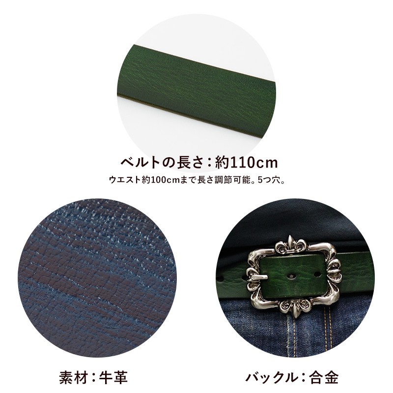 肉厚のある重厚でしっとりとした質感のオイルレザーを使用してます。5種類のバックルから選びいただけます!カラーも、グリーン・レッド・ブルー・ブラウン・キャメル・ブラックの6種類!【素材】ベルト:牛革  バックル:合金 スタッズ:合金【サイズ】ベルト:長さ110Cm 幅3.8Cm 厚み:0.4Cm 【仕様】着用許容範囲:100Cmまで ベルト穴6穴(2.5Cm間隔)    ※長さ調節できます。