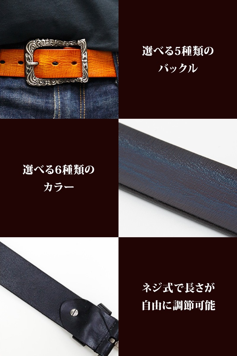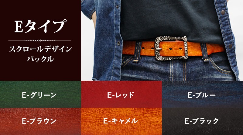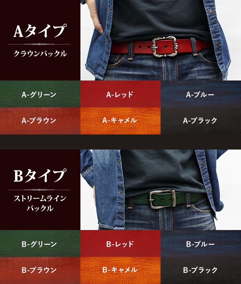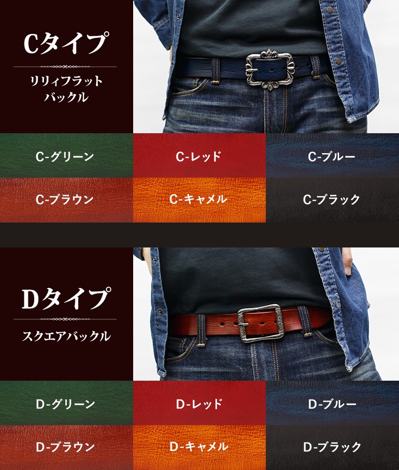 カラーは、レッド・グリーン・ブルー・ブラウン・キャメル・ブラックの6色からお選びいただけます。バックルのパターンは5種類ご用意しました!30パターンのなかから、あなたにピッタリのベルトを見つけてください。