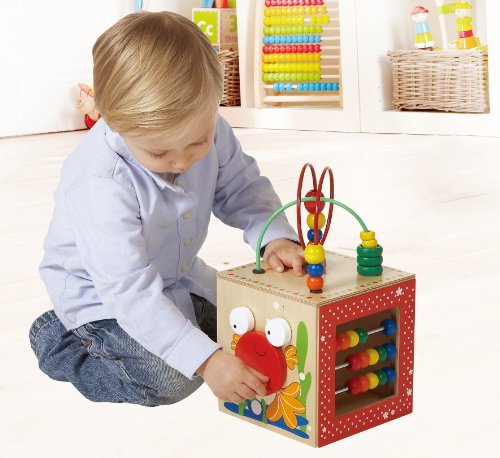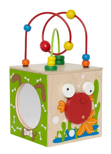 There’s fun to be had at every turn! Early explorers will love this fun and interactive Discovery Box Activity Cube from Hape Toys. Five colorful and unique sides keep curious hands busy as they explore and discover. Complete with a wire maze, mirror, abacus, spinning fun discovery fish and more! The Discovery Box encourages little children by engaging their imaginations with repetitive play that helps develop fine motor skills. Each activity stimulates cognitive, visual, and tactile senses. With a wire bead maze on top, this classically designed legacy toy will be in your family for years to come. Made from wood sourced from environmentally sustainably sourced forests. Hape toys stimulate children through every stage of development and help nurture and develop their natural abilities. All Hape products sold in North America meet or exceed all applicable safety standards.Feature