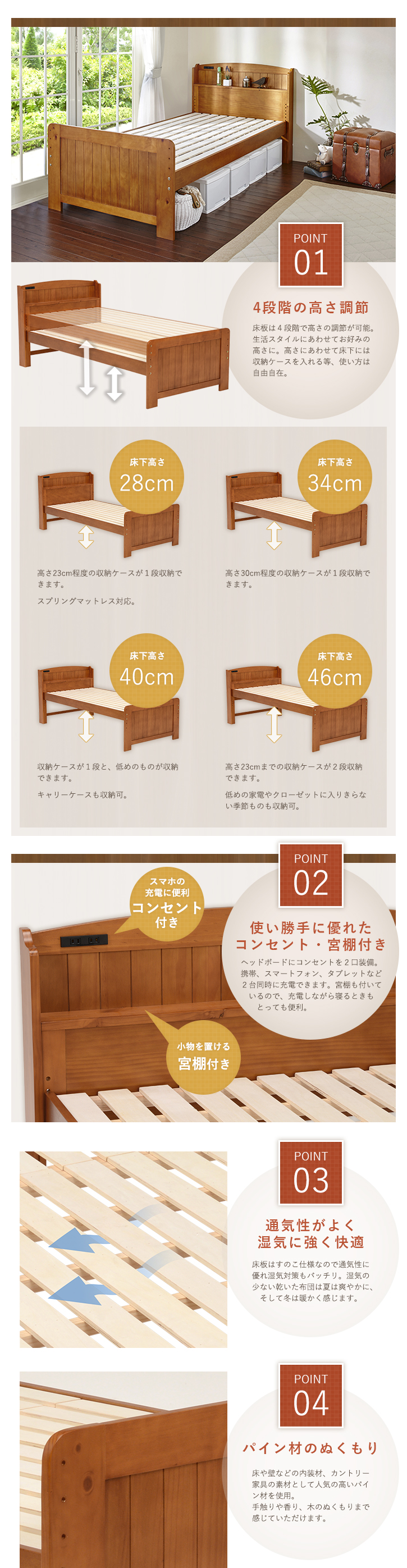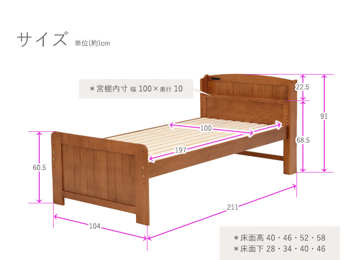 ■ 床面内寸:(約)幅100×長さ197cm■ 床下スペース28・34・40・46cmで組み立て可能■ 宮棚、2口コンセント付き■ 組立式