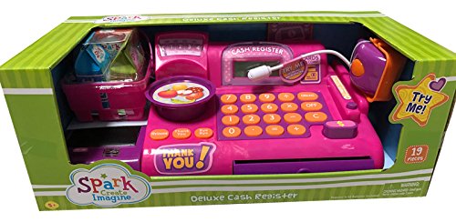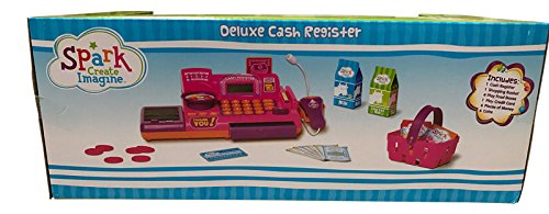 -. Feature : Educational cash register that encourages children to learn basic math, essential money skills, while enhancing imaginative play. / This supermarket cash register comes with a functioning calculator, cool sounds, play money and a basket full of groceries! / Provides full pretend & play experience with conveyor belt, scanner, calculator, and microphone / Comes with credit cards that when child swipes, the drawer will automatically open