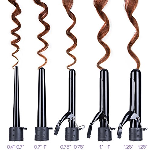 INTERCHANGEABLE BARRELS FOR ALL TYPES OF CURLS. With five different sizes of ceramic tourmaline barrels you can give your hair anything from soft waves to tight curls.