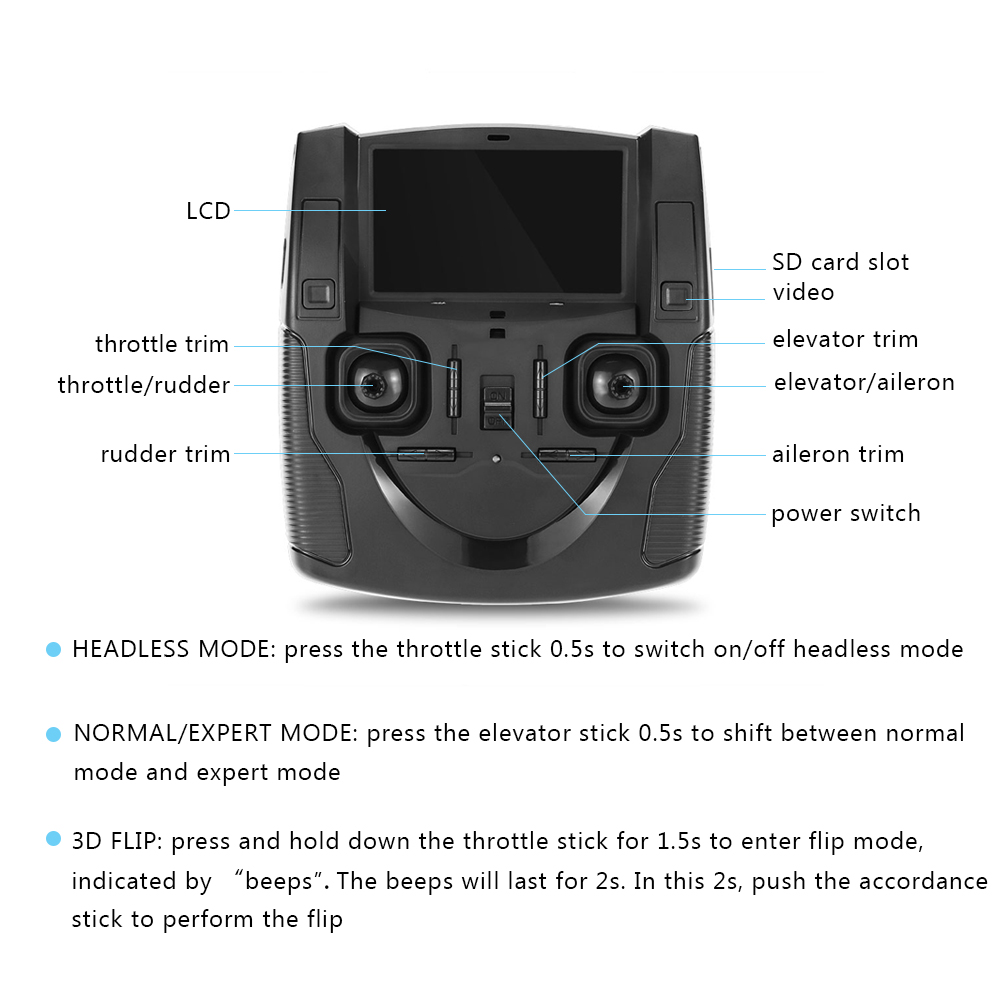 Function: forward/backward, up/down, left/right, sideward flight, 3D-Flip, headless mode, take video, expert mode