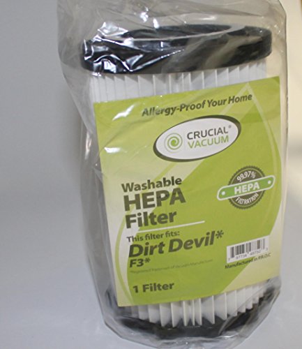 -. Title : Dirt Devil F3 HEPA Filter; Washable & Reusable; Compare to Dirt Devil F-3 Part # 3-250435-001 (3250435001); Designed & Engineered by Crucial Vacuum