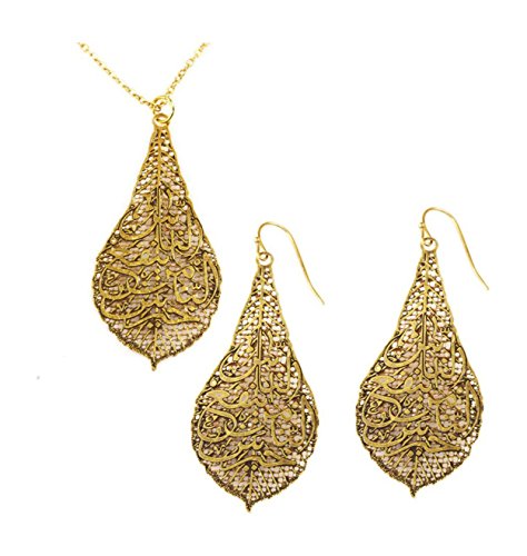 -. Binding : Jewelry -. Brand : P.R.Icegems -. Department : womens -. Feature : Total Weight: 6 Grams | Setting: no-stamp, Base | Width: 0.75 IN | Length: 18 IN | Height: 2 IN | Origin: USA | Condition: New | Includes: Gift Pouch/Bag / Includes an informative History Card and attractive P.R.Icegems signature gift packaging / Handcrafted in USA under strict standards of quality and workmanship | 90 Day Limited Warranty | Includes Presentation Bag / Box | Photos enlarged to show detail -. ManufacturerPartsWarrantyDescription : Parts are included -. ProductGroup : Jewelry -. ProductTypeName : FASHIONOTHER -. Title : Calligraphy Leaf Islamic Mesopotamia Pendant and Earrings, ' The Good People, Are Those Who Help People'
