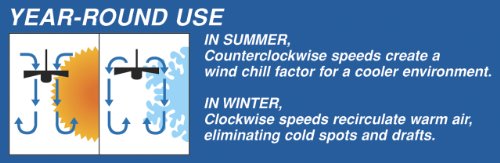 153-millimeter by 15-millimeter silicon steel motor with triple capacitor; three fan speeds (high/medium/low); reversible switch for year-round use