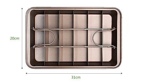 Studio : SUJUDE Publisher : SUJUDE Product Description The secret to perfect brownies is the Slice Solutions Brownie Pan This one-of-a-kind pan uses an ingenious metal divider to pre-slice brownies as they bake The non-stick set makes baking brownies quick and easy with perfect results every time. Simply pour batter into the pan, insert the divider, bake, and serve. You no longer need to use a knife. Oven safe to 450°F / 232°C; Dishwasher safe, however hand-washing is recommended to extend product life MADE IN CHINA 100% lifetime guarantee.There is no risk to you, try it ,if you don't love it .return it for a refund! HOPE YOU LOVE IT! 0