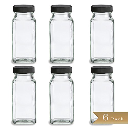 Set of 6 - TrueCraftware 6 oz French Square Glass Spice Shaker Jars with Black Lids and Shaker Inserts