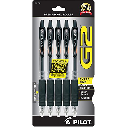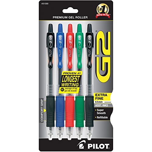 Pilot G2 Retractable Premium Gel Ink Roller Ball Pens, Extra Fine Point, 5-Pack, Assorted Colors, Black/Blue/Red/Green Inks (31300)